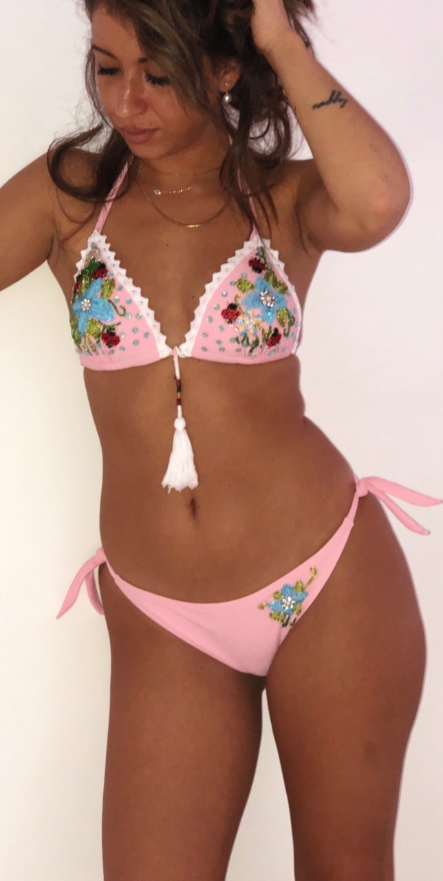 Mαγιό Boho, μπικίνι σετ, με πλεκτή δαντέλα, διακοσμημένο με κοσμημα φούντα. Λουλούδια κεντημένα στο χέρι, με στρας και πέρλες.με πούλιες και διάφανες χρωματιστές χάντρες. Το σουτιέν έχει επένδυση, κούμπωμα πίσω και δέσιμο στο λαιμό. Το σλιπ είναι με δέσιμο στο πλάι.
