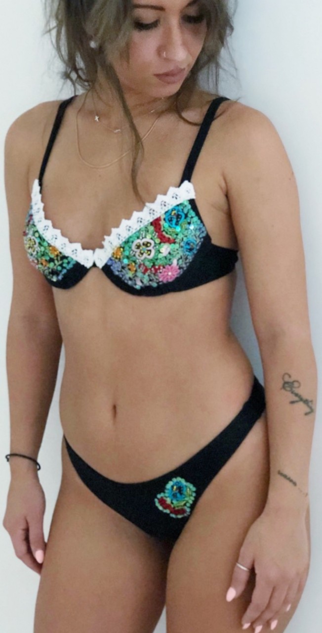 Mαγιό Boho, μπικίνι σετ, με πλεκτή δαντέλα, με λουλούδια κέντημα στο χέρι από ανεξίτηλης βαφής κλωστές, με πούλιες και διάφανες χρωματιστές χάντρες. Το σουτιέν έχει μπανέλες και κούμπωμα πίσω. Το σλιπ είναι κλασικό.